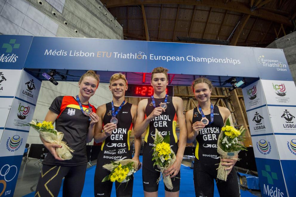 Mit dem Bronzerang drei für die gemischte Staffel der DTU-Junioren endeten die Triathlon-Europameisterschaften in Lissabon (Portugal). Die vier deutschen Talente waren in der Reihenfolge Lena Meißner (Neubrandenburg), Paul Weindl (Saarbrücken), Lisa Tertsch und Moritz Horn (beide Potsdam) gestartet und alle hatten jeweils 250 Schwimmmeter, fünf Radkilometer sowie 1700 Laufmeter zu meistern. Nach 1:08:00 Stunden durften sie dann ihre Medaille bejubeln. Europameister können sich Briten (1:07:48 Stunden) nennen, Spanien behielt um eine Sekunde vor der DTU-Mannschaft Rang zwei. Zuvor hatte das mit den Juniorinnen Lina Völker (Stadtlohn) und Lena Neuburg (Köln) sowie den Perspektiv-Athleten Jonas Breinlinger (Saarbrücken) und Lasse Lührs (Potsdam) besetzte Elite-Team nach 1:09:52 Stunden Rang sieben belegt. Europameister wurden auch hier die Briten (1:07:11 Stunden), so dass Einzelsiegerin India Lee als Doppel-Europameisterin die Heimreise antreten konnte. Rang zwei ging an Russland (1:07:20 Stunden) vor Ungarn (1:07:27 Stunden).